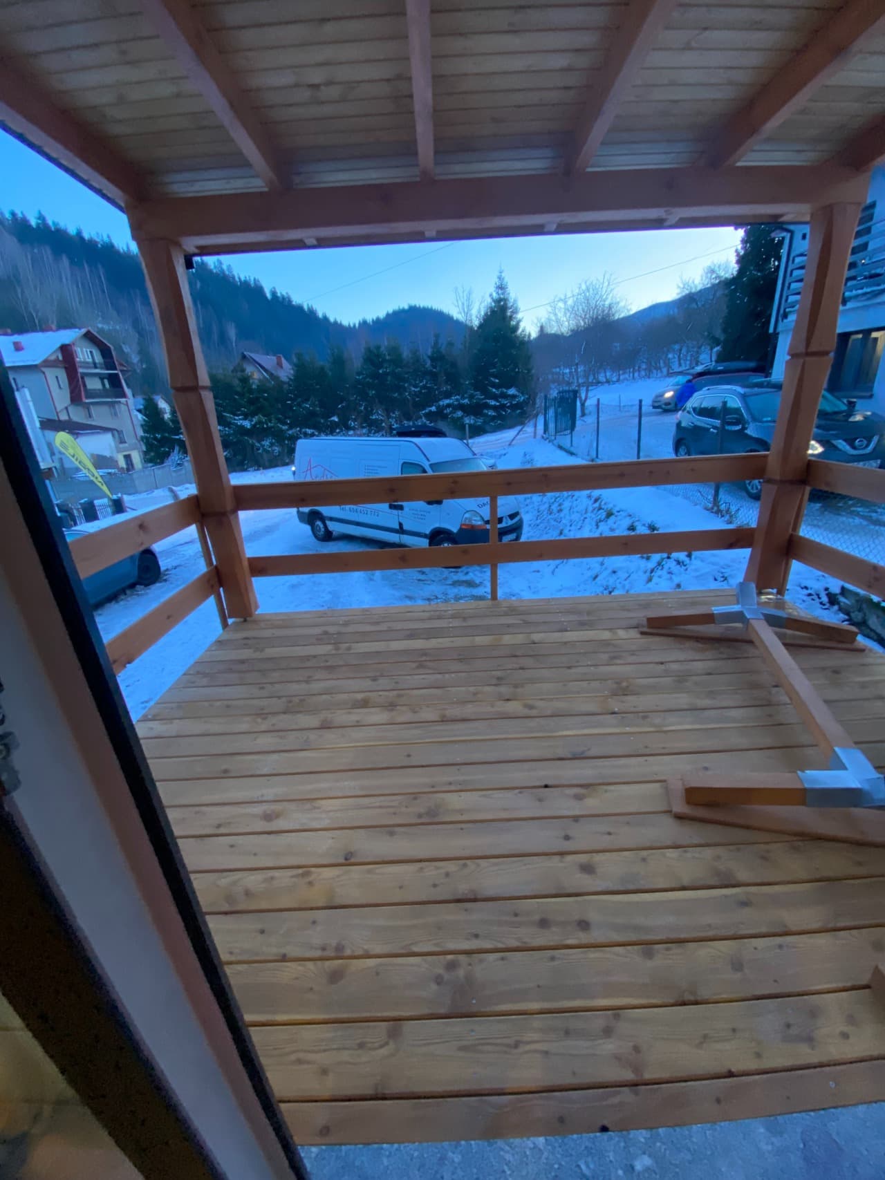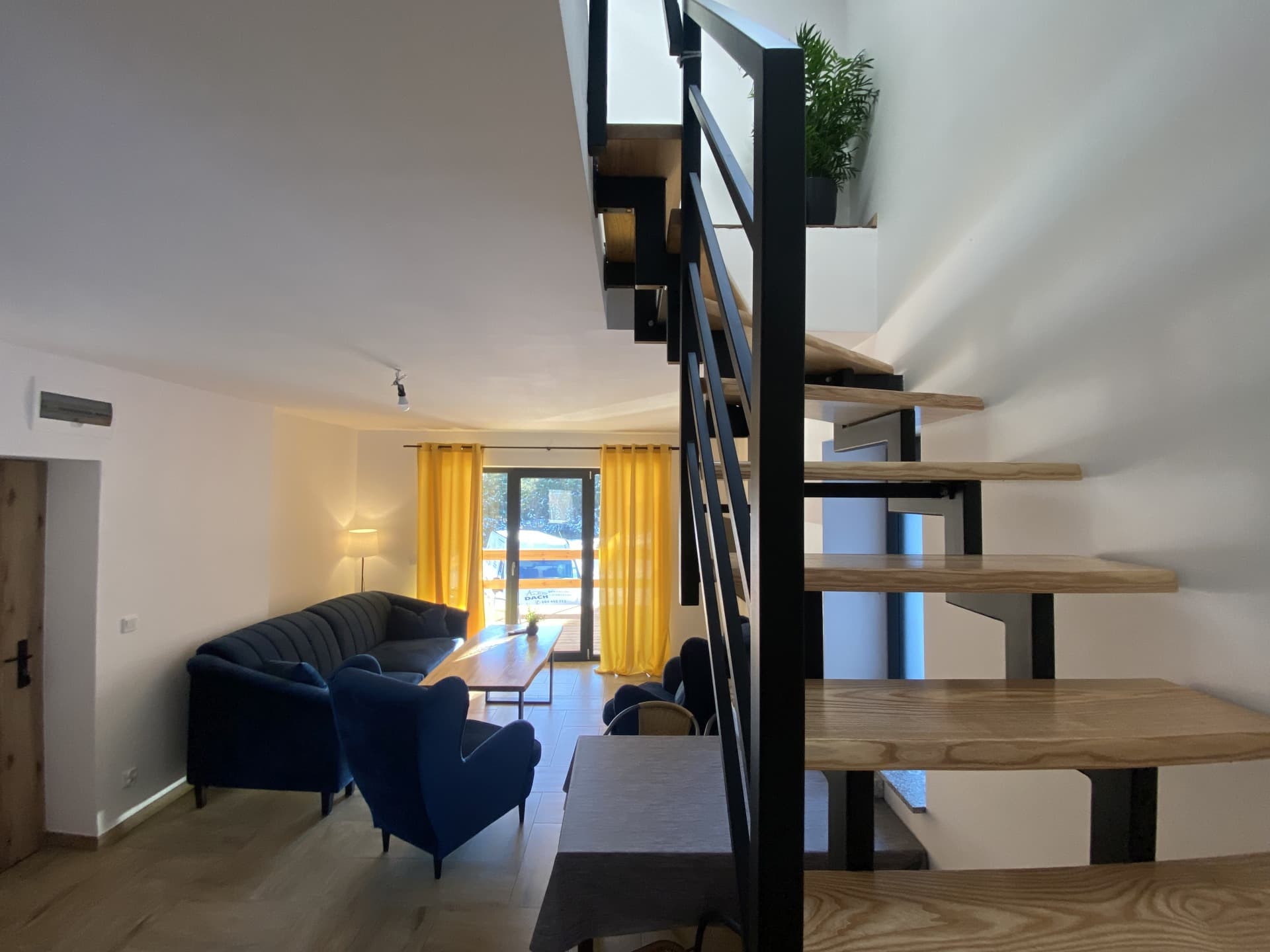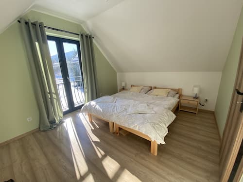 Apartament "Górski" - nr 2 położony jest na półpiętrze. Posiada dwie sypialnie na piętrze, 2 łazienki (jedna z prysznicem i wanną, druga z prysznicem), duży salon z wygodną, dużą rozkładaną sofą, wyposażoną kuchnię z jadalnią oraz duży zadaszony taras z widokiem (11m2).